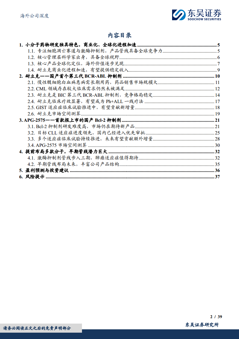 核心管理层科学家出身,具备全球视野 公司核心管理层由杨大俊博士(董事长、CEO)、王少萌博士(非执行董事兼首席科学顾问)和翟一帆博士(首席医学官)等科学家组成,他们在肿瘤学、细胞凋亡机理、新药研发及临床医学研究方面拥有深厚背景和近30年的经验,为公司提供了强大的研发领导力和全球视野。公司股权结构稳定,实控人为核心管理层一致行动人,截至2024年6月30日持有24.80%股份。武田制药通过股权投资持有公司7.73%股份,进一步强化了国际合作。
