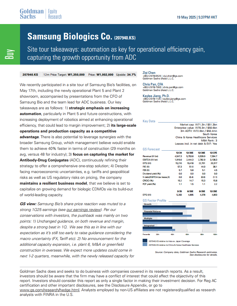 三星生物制剂通过战略性地强调自动化、利用其大规模产能和三星集团的协同效应,以及积极布局新兴的ADC市场,展现出强大的增长潜力和业务韧性。尽管面临宏观经济和监管挑战,公司凭借其世界领先的产能建设,有望持续抓住生物制剂CDMO市场的增长机遇。高盛维持“买入”评级,并预计公司在未来几年将实现稳健的营收和盈利增长,但投资者需关注潜在的市场竞争、产能扩张速度及监管风险。