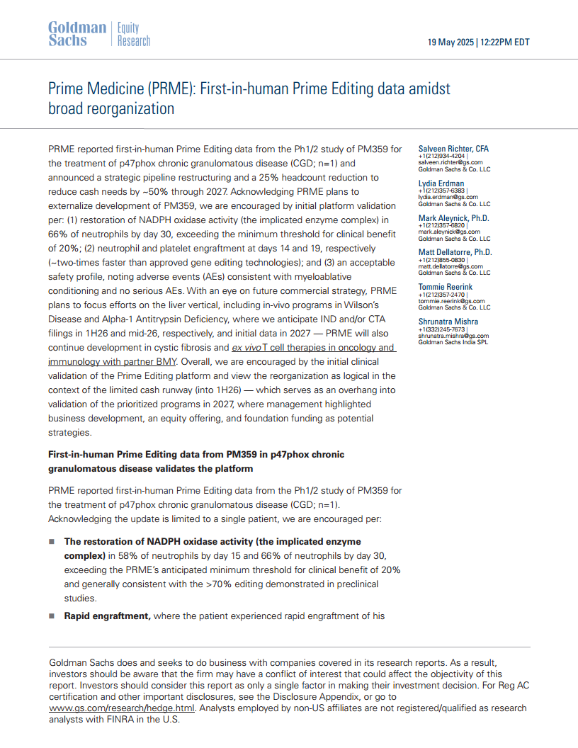 普莱姆医药(PRME):Prime Medicine (PRME)大规模重组中的首例人体先导编辑数据