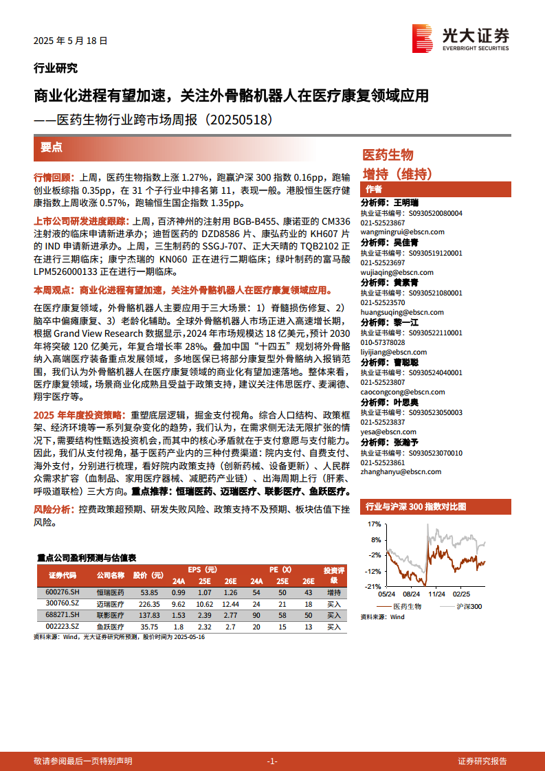 医药生物行业跨市场周报:商业化进程有望加速,关注外骨骼机器人在医疗康复领域应用