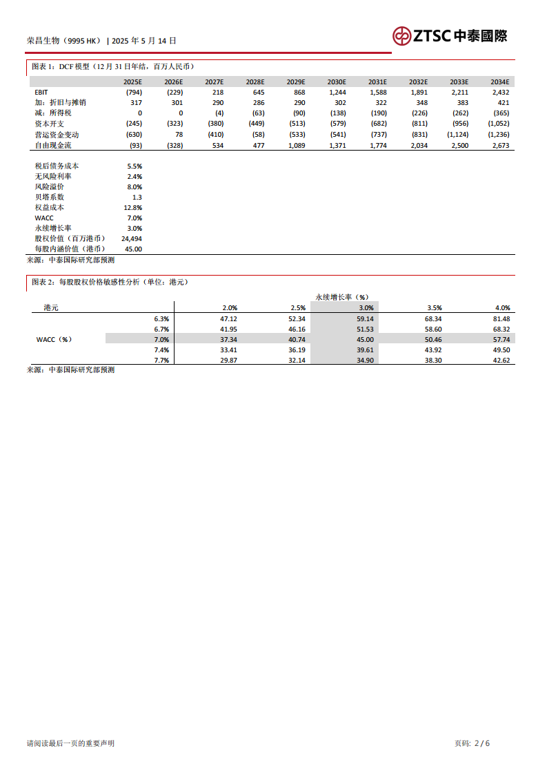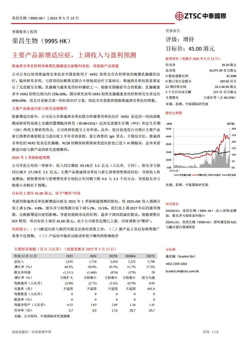 鉴于维迪西妥单抗新增适应症的获批以及2025年第一季度业绩超出预期,分析师对荣昌生物的财务预测进行了上调。具体而言,2025-2026年的收入预测分别上调了3.2%和4.8%,而股东净亏损预测则分别下调了5.2%和13.5%。同时,2027年后的盈利预测也因新增适应症的影响而同步上调。考虑到香港股市市况的好转,分析师温和下调了风险溢价假设。基于调整后的DCF(现金流折现)模型,荣昌生物的目标价被上调至45.00港元。由于公司股价近期已有所上涨,评级由“买入”调整为“增持”,反映了分析师对公司未来增长潜力的持续看好。