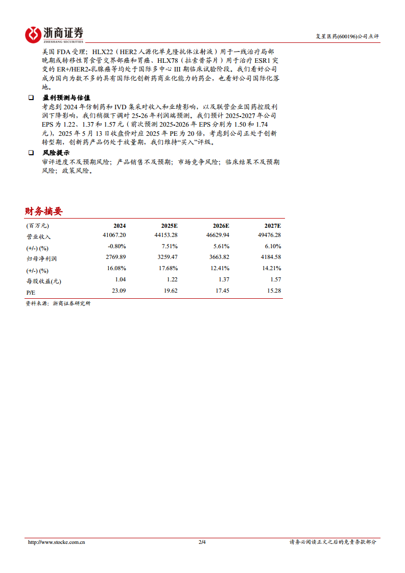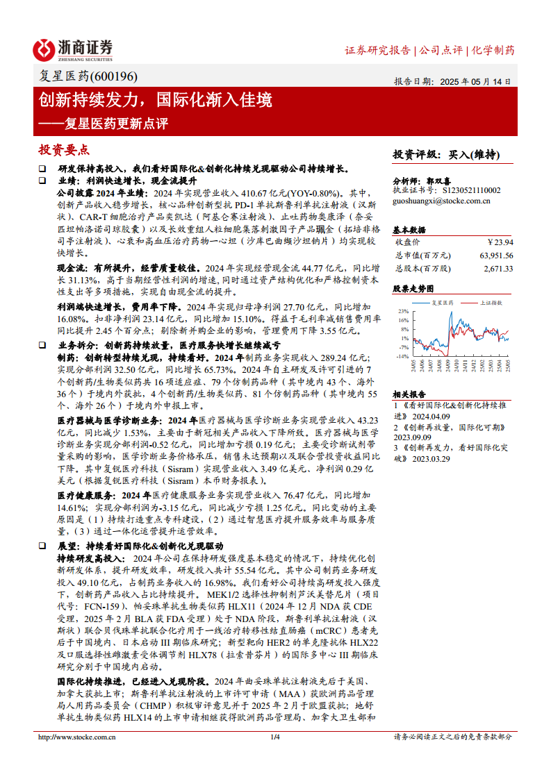 复星医药在2024年展现出稳健的经营态势,尽管营业收入略有下降,但归母净利润和经营现金流均实现显著增长,显示出良好的盈利能力和经营质量。公司持续高强度研发投入,推动创新药管线不断丰富,并加速国际化布局,多个核心产品已在海外市场取得突破性进展。制药业务的创新转型成果显著,医疗健康服务业务减亏提效,而医疗器械与医学诊断业务则面临集采压力。展望未来,公司有望凭借其创新驱动和国际化战略的持续兑现,实现长期可持续增长。尽管面临审评进度、产品销售、市场竞争、临床结果及政策等风险,但其在创新药领域的深耕和全球化拓展将为其带来新的增长机遇。