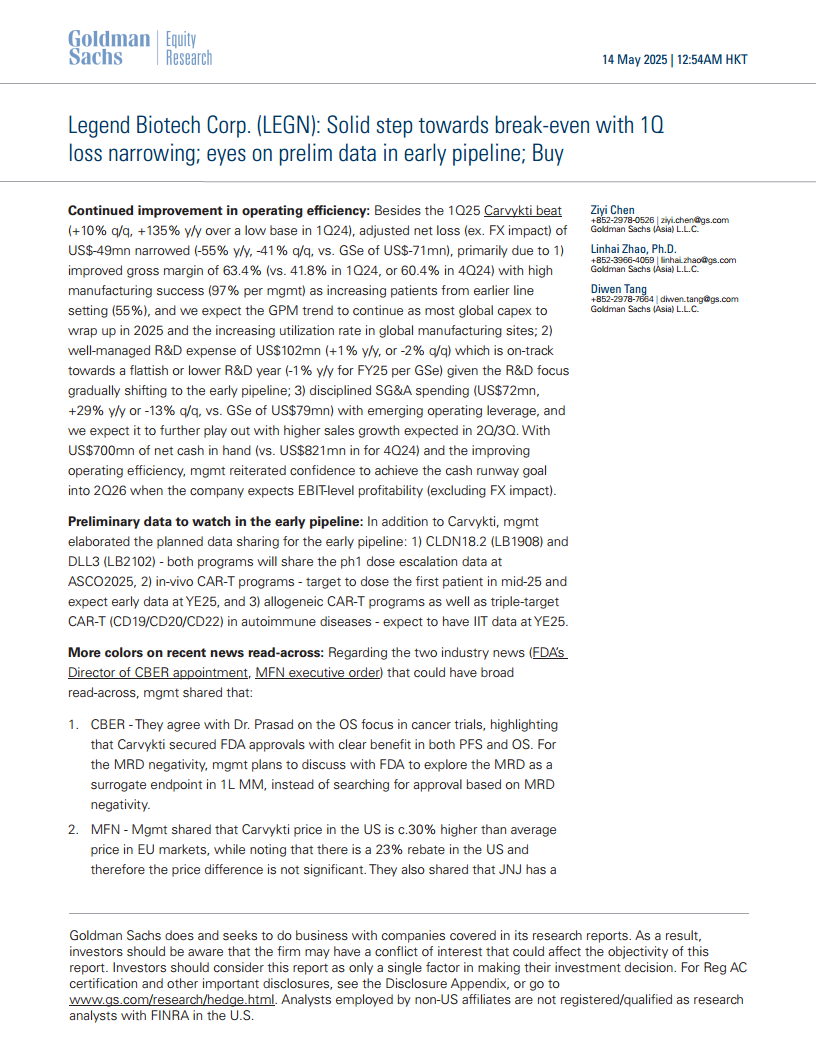 传奇生物(LEGN):传奇生物公司(LEGN)朝着盈亏平衡迈出坚实一步,第一季度亏损收窄;关注早期管线的初步数据;买入