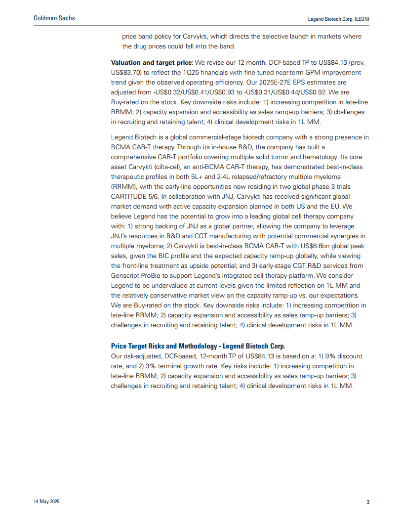高盛维持对Legend Biotech的“买入”评级,并将目标价上调至84.13美元。分析认为,Carvykti作为同类最佳BCMA CAR-T疗法,在全球市场需求旺盛,且一线多发性骨髓瘤的治疗机会被视为巨大的潜在增长点,但这些潜力尚未完全反映在当前估值中。尽管公司面临晚期RRMM竞争加剧、产能扩张挑战、人才招聘与保留以及1L MM临床开发风险等下行因素,但凭借与强生的强大合作关系和自身整合的细胞疗法平台,Legend Biotech有望成长为全球领先的细胞疗法公司。