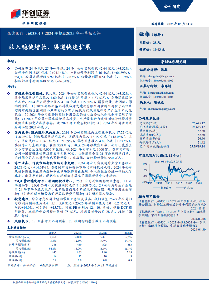 振德医疗(603301):2024年报、2025年一季报点评:收入稳健增长,渠道快速扩展