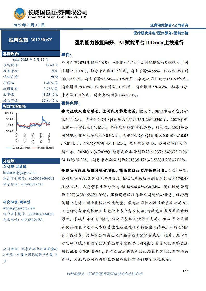 泓博医药在2024年实现了营收的稳健增长,并在2025年第一季度展现出强劲的盈利能力修复态势,归母净利润和扣非归母净利润均实现大幅增长。这主要得益于药物发现核心业务的稳健发展和商业化生产板块的快速放量。公司在市场拓展方面表现出色,CRO/CDMO活跃客户数量实现近翻倍增长,在手订单充足。更重要的是,公司持续加大研发投入,成功开发并上线了基于生成式AI的生物医药大模型DiOrion-GPT,将其集成至一站式早期药物发现平台DiOrion,极大地提升了药物发现效率和创新能力,为公司构筑了差异化竞争优势和长期增长潜力。尽管面临新签订单不及预期、人才流失、毛利率下滑等风险,但综合考虑其平台化布局、技术壁垒及业务拓展潜力,公司未来业绩增长可期。