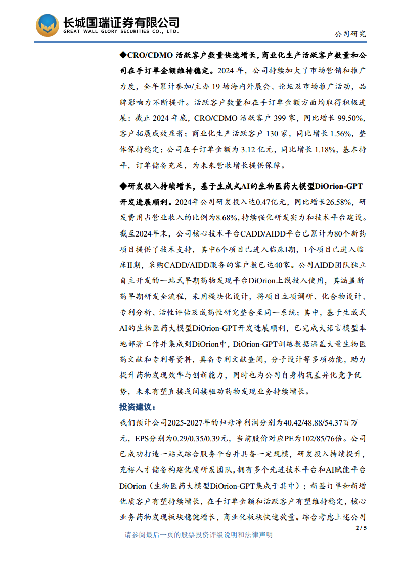 公司持续加大研发投入,成功开发并上线了基于生成式AI的生物医药大模型DiOrion-GPT,将其集成至一站式早期药物发现平台DiOrion,显著提升了药物发现效率和创新能力。同时,CRO/CDMO活跃客户数量实现近翻倍增长,在手订单充足,为未来业绩增长奠定了坚实基础。