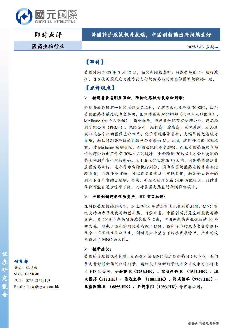 本报告分析指出,美国总统特朗普签署的药价行政令对美国大型药企利润的实际影响有限,主要原因在于美国医药体系的复杂性、行政令影响范围的局限性(主要针对Medicaid,约占10%)以及药企出厂价与市场价之间存在的缓冲。然而,这一政策的扰动,叠加2028年前后大量专利药到期的背景,将显著增强跨国药企(MNC)寻求优质创新药资产的动力。中国创新药凭借过去十年在研发、临床资源和人才方面的积累,已成为全球最具吸引力的优质资产。因此,报告坚定看好中国创新药的全球化前景,并预计BD合作将加速,建议投资者关注具有全球竞争力创新药管线的相关公司。