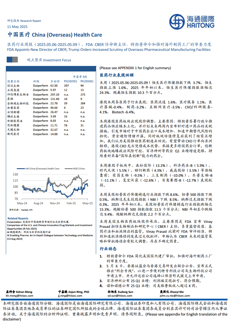 医药行业周报(2025.05.06-2025.05.09):FDA CBER 任命新主任,特朗普命令加强对海外制药工厂的审查力度