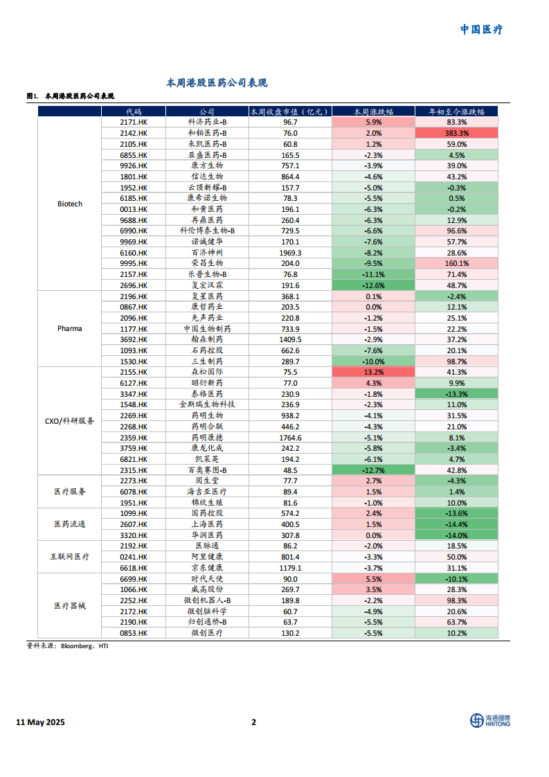 本周(2025年5月6日至2025年5月9日),港股医药板块整体承压,恒生医疗保健指数下跌3.7%,而同期恒生指数上涨1.6%。然而,从年初至今的表现来看,恒生医疗保健指数累计涨幅达24.3%,跑赢恒生指数10.3个百分点,显示出前期强劲的估值修复。在港股各医药子行业中,医药流通(+1.6%)和医疗服务(+1.1%)表现领先,而医疗器械(-0.4%)、制药(-3.2%)、互联网医疗(-3.5%)、CXO/科研服务(-4.1%)和Biotech(-6.4%)则出现不同程度的下跌。个股方面,森松国际(+13.2%)、科济药业-B(+5.9%)和时代天使(+5.5%)涨幅靠前,而百奥赛图-B(-12.7%)、复宏汉霖(-12.6%)和乐普生物-B(-11.1%)表现较弱。