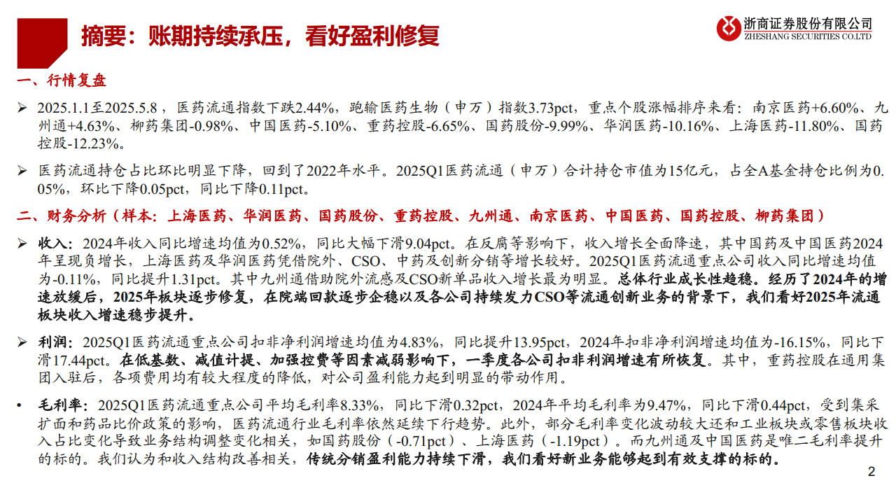 本报告核心观点指出,尽管医药流通行业在2024年及2025年第一季度持续面临应收账款账期延长带来的压力,导致收入增速放缓和信用减值损失增加,但行业整体盈利能力已显现修复迹象。尤其在2025年第一季度,扣非净利润增速显著回升,这主要得益于低基数效应减弱、减值计提影响降低以及各公司持续加强降本控费措施。报告对2025年流通板块收入增速稳步提升持乐观态度,认为院端回款逐步企稳以及CSO(合同销售组织)等创新流通业务的发力将是主要驱动因素。