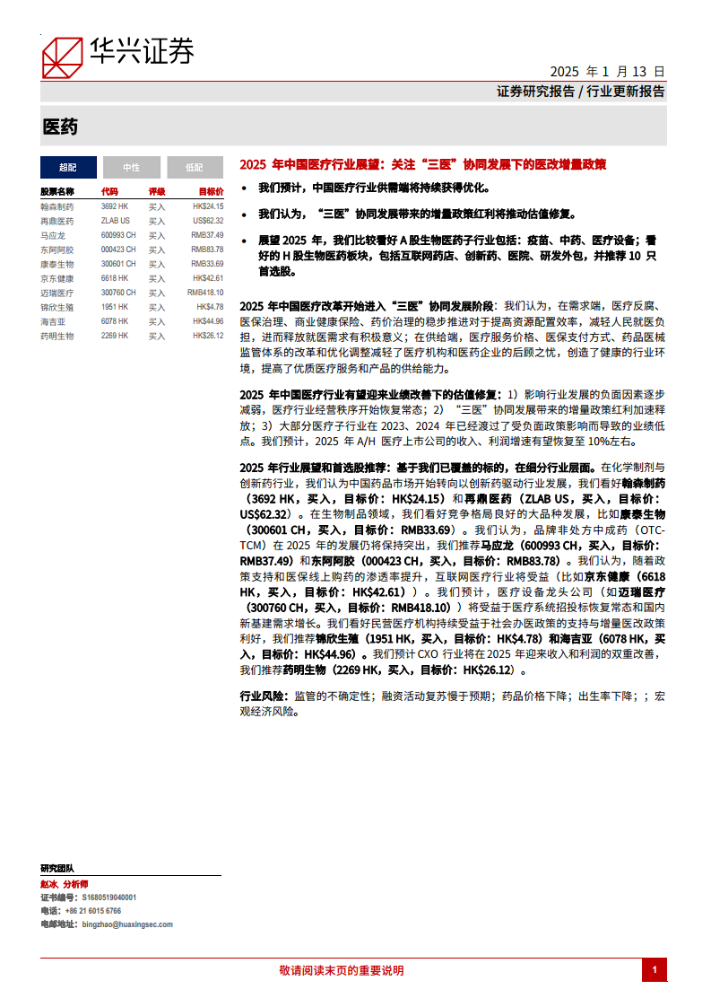 本报告核心观点指出,2025年中国医疗行业将进入“三医”(医疗、医保、医药)协同发展的新阶段,通过需求端和供给端的持续优化,推动行业实现高质量增长。预计在增量政策红利加速释放、负面因素逐步减弱以及业绩低点已过的背景下,A/H股医疗上市公司有望迎来估值修复,收入和利润增速有望恢复至10%左右。