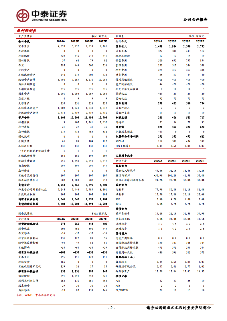 根据财报数据,预计2025-2027年公司收入分别为19.84亿元、23.50亿元、27.55亿元,同比增长36%、18%、17%;归母净利润分别为3.52亿元、4.72亿元、6.22亿元,同比增长28%、34%、32%。考虑到公司未来三年内生增长潜力及外延布局带来的发展可能性,维持“买入”评级。