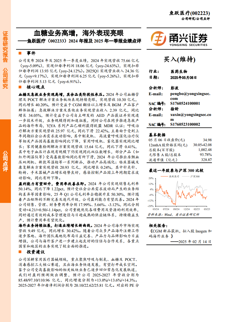鱼跃医疗(002223):2024年报及2025年一季报业绩点评:血糖业务高增,海外表现亮眼