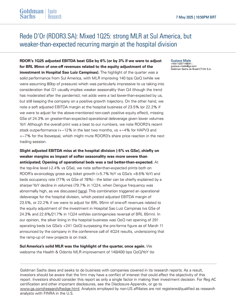 雷迪奥尔(RDOR3.SA):Rede D'Or (RDOR3.SA)2025年第一季度喜忧参半,南美洲地区MLR表现强劲,但医院部门的经常性利润率低于预期