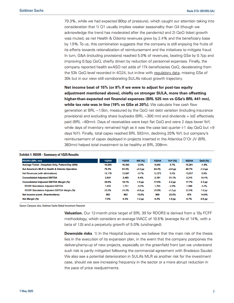 Rede D'Or在2025年第一季度呈现出喜忧参半的业绩。尽管整体调整后EBITDA超出预期,主要得益于Sul America业务在医疗损失率(MLR)方面的出色改善,显示出公司在成本控制和运营效率提升方面的成效。然而,医院业务受销量下降和运营杠杆减弱影响,利润率低于预期,但新床位扩张的稳步推进预示着未来增长潜力。公司财务指标表现稳健,自由现金流充裕,资本支出得到有效管理。高盛维持“买入”评级和39巴西雷亚尔的目标价,但同时指出医院扩张计划的执行和Sul America MLR的潜在波动是主要的下行风险。