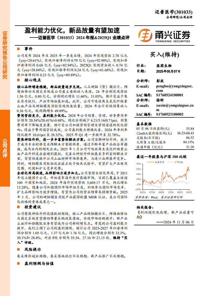 迈普医学(301033):2024年报、2025Q1业绩点评:盈利能力优化,新品放量有望加速