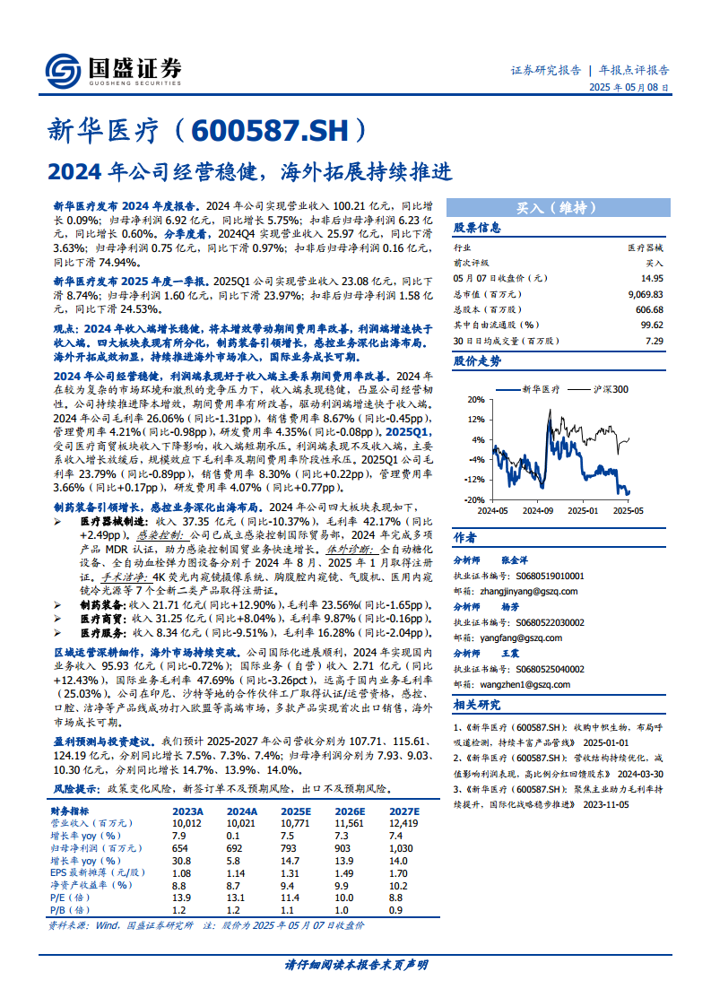 新华医疗在2024年展现了稳健的经营态势,尽管营收增长平缓,但通过降本增效实现了利润端的较快增长。制药装备业务表现突出,成为核心增长引擎,而感染控制业务的国际化布局也取得了积极进展。公司国际化战略成效初显,海外业务收入和毛利率均表现优异,预示着未来国际市场将成为重要的增长点。尽管2025年一季度业绩短期承压,但分析师对公司未来营收和净利润的持续增长持乐观态度,并维持“买入”评级,同时提示了相关风险。