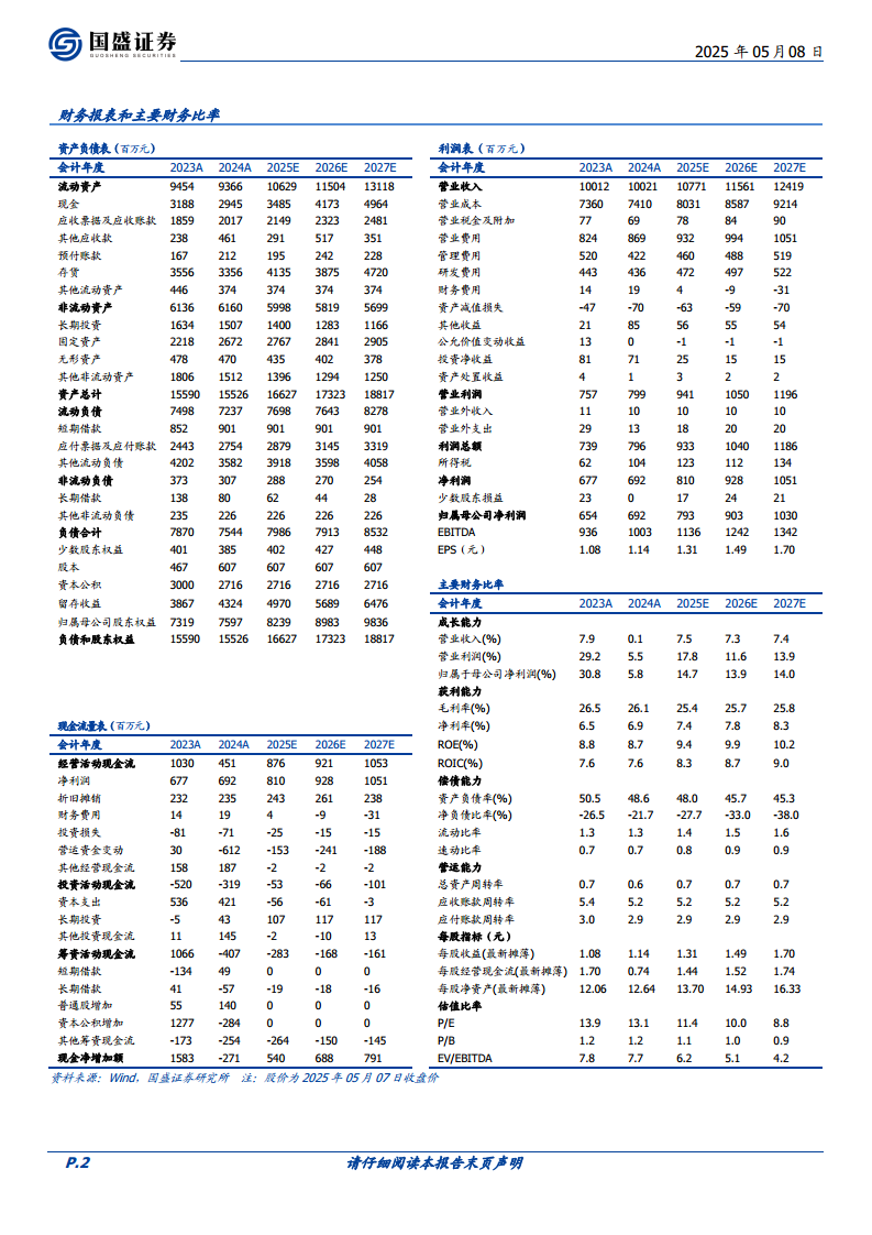 国盛证券研究所预计公司2025-2027年营收分别为107.71亿元、115.61亿元、124.19亿元,分别同比增长7.5%、7.3%、7.4%。归母净利润分别为7.93亿元、9.03亿元、10.30亿元,分别同比增长14.7%、13.9%、14.0%。