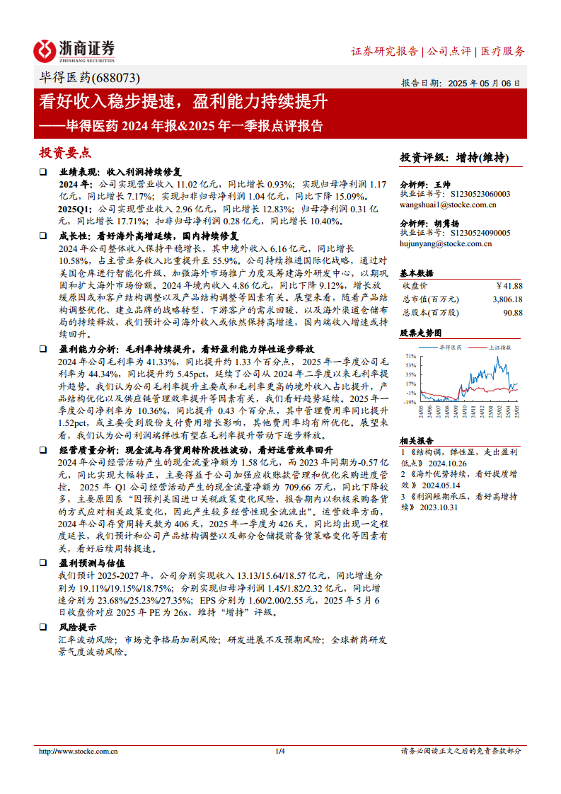 毕得医药在2024年及2025年一季度展现出稳健的业绩修复和加速增长势头,尤其在2025年一季度,营收和归母净利润增速均显著加快。公司国际化战略成效显著,境外收入实现高速增长并成为主要收入来源,有效带动了整体毛利率的持续提升。尽管短期内经营现金流和存货周转受特定因素影响有所波动,但公司通过优化管理和战略性备货积极应对。展望未来,随着海外市场持续扩张、国内业务结构调整优化以及盈利能力的逐步释放,公司业绩有望保持良好增长。基于此,报告维持对毕得医药的“增持”投资评级,并对其未来盈利能力和市场表现持积极预期。