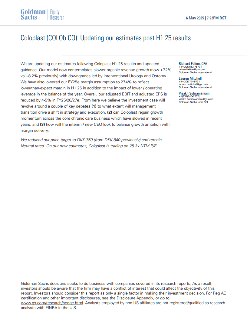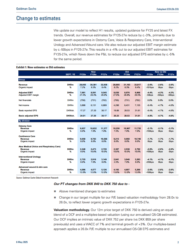 高盛在Coloplast公布2025财年上半年业绩并更新指引后,对其估值模型进行了修订。报告维持了对Coloplast的“中性”评级,并将其12个月目标价从之前的840丹麦克朗下调至750丹麦克朗。此次目标价下调主要基于两方面原因:一是财务预测的整体调整,二是P/E估值方法中目标倍数从28.0倍降至26.0倍,以反映对2025-2027财年较低有机增长的预期。根据新的估算,Coloplast目前以25.3倍的未来12个月市盈率(NTM P/E)进行交易。