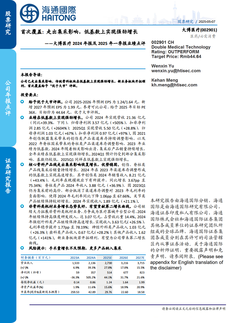 大博医疗(002901):2024年报及2025年一季报业绩点评:首次覆盖:走出集采影响,低基数上实现强劲增长