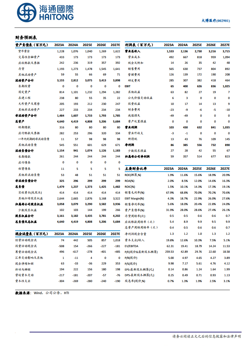 海通国际首次覆盖大博医疗(002901),基于其走出集采影响后的强劲增长态势和新业务的良好发展前景,给予“优于大市”评级。报告预测公司2025-2027年每股收益(EPS)分别为1.24元、1.64元和1.99元。参考可比公司估值,报告给予大博医疗2025年目标市盈率(PE)36倍,对应目标价为44.64元。
