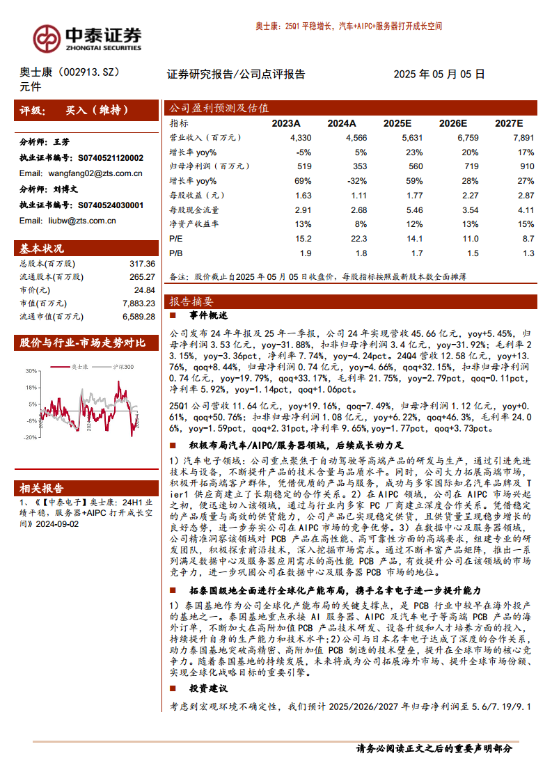 - 奥士康在2025年第一季度实现了营收和归母净利润的平稳增长,展现出良好的发展韧性。