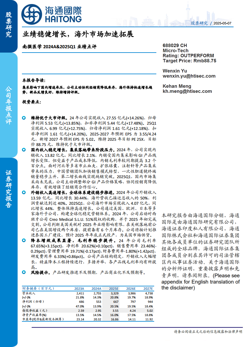 南微医学在2024年及2025年第一季度实现了收入和归母净利润的稳健增长,显示出公司在复杂市场环境下的韧性。尽管国内市场受到集中采购政策的阶段性压力,导致部分产品线增速承压,但公司通过积极调整销售策略、优化产品成本,有效应对了挑战。