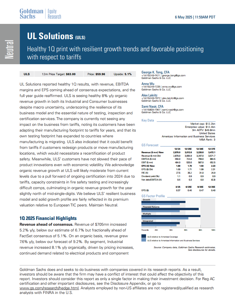 公司目前未受关税的实质性影响,客户已通过调整制造布局来适应关税政策,UL Solutions自身的测试足迹也已扩展到制造业迁移的国家。公司甚至可能从关税中受益,因为产品重新设计或制造地点转移将带来产品再认证需求。尽管预计未来有机营收增长将因前期认证需求提前、消防安全测试产能限制及比较基数提高而有所放缓,但UL Solutions凭借其稳健的业务模式和良好的增长前景,其相对于欧洲TIC同行的溢价估值被认为是合理的。高盛维持对该股的“中性”评级,并将12个月目标价上调至63美元。