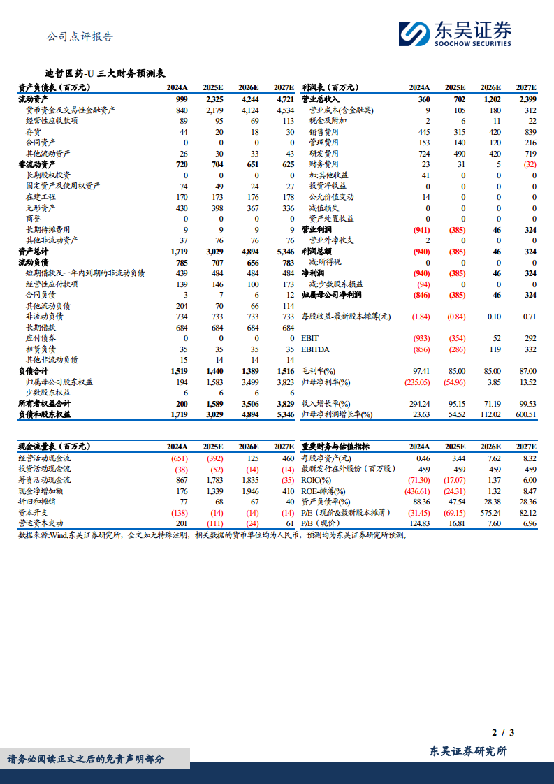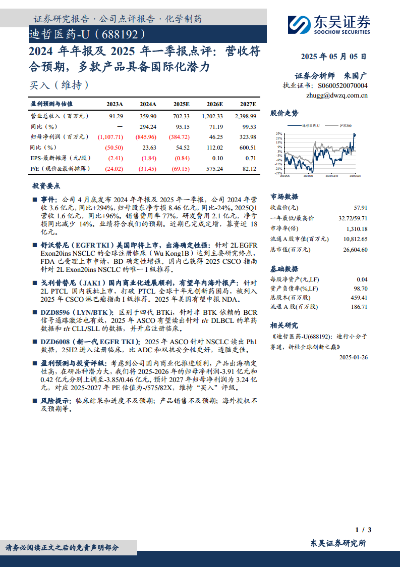 考虑到公司国内商业化推进顺利、产品出海确定性高以及在研品种潜力大,东吴证券将迪哲医药2025-2026年的归母净利润预测分别上调至-3.85亿元和0.46亿元(原预测为-3.91亿元和0.42亿元)。预计2027年归母净利润为3.24亿元,对应2025-2027年PE估值为-/575/82X。基于此,维持公司“买入”评级。