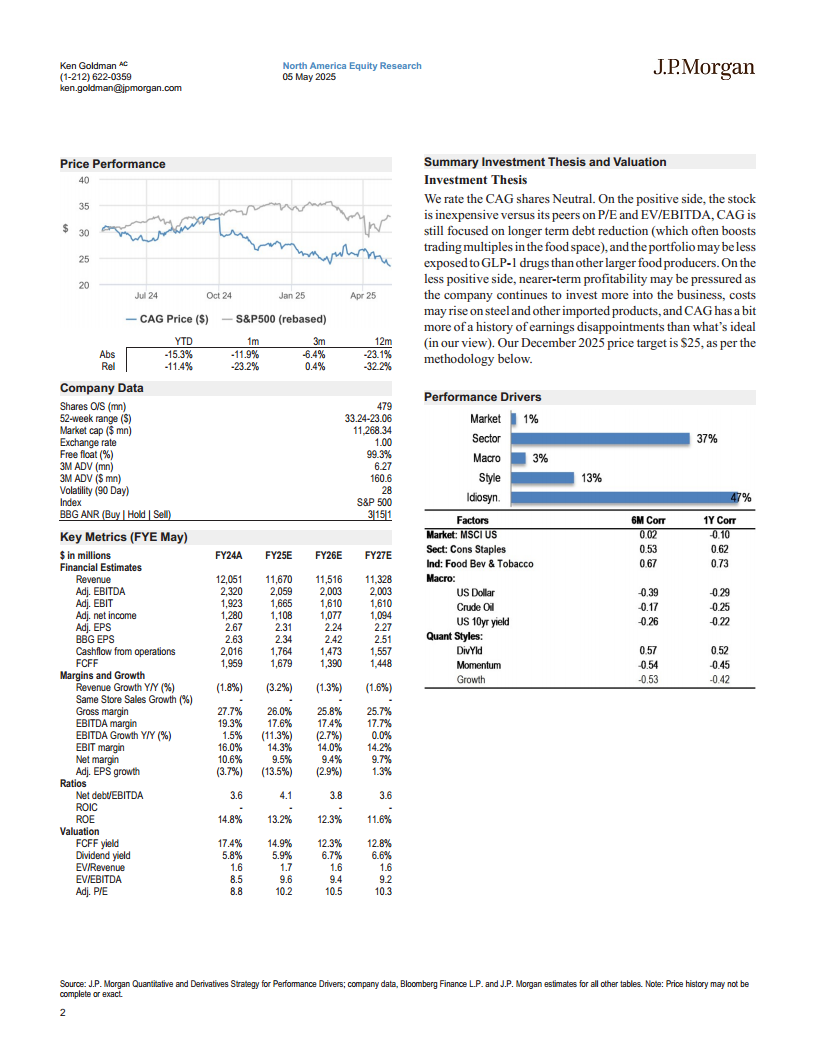 康尼格拉品牌公司(CAG,CAG US):康尼格拉品牌公司更新估值以反映大厨博亚迪品牌剥离情况