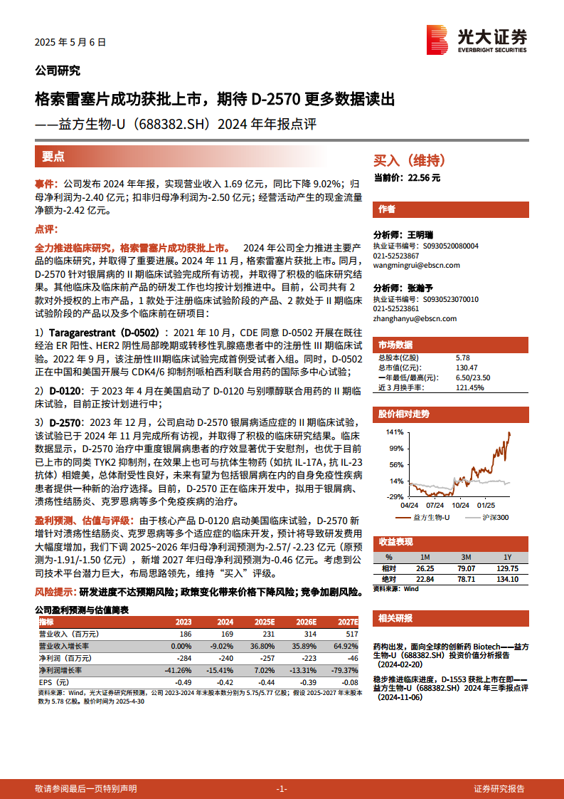 益方生物(688382):2024年年报点评:格索雷塞片成功获批上市,期待D-2570更多数据读出