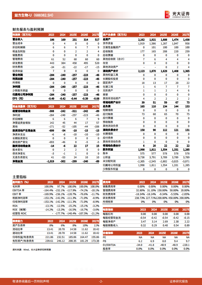 研发费用率在2024年高达227.71%,预计在2025年将飙升至1200.00%,并在2026-2027年维持高位(450.00%和200.00%),显示公司对研发的持续高投入。管理费用率也较高。受此影响,公司毛利率虽高(97.7%-100%),但归母净利润率持续为负,2024年为-142.3%,预计2027年仍为-8.9%。ROA和ROE也持续为负,反映出公司在研发投入期的盈利压力。