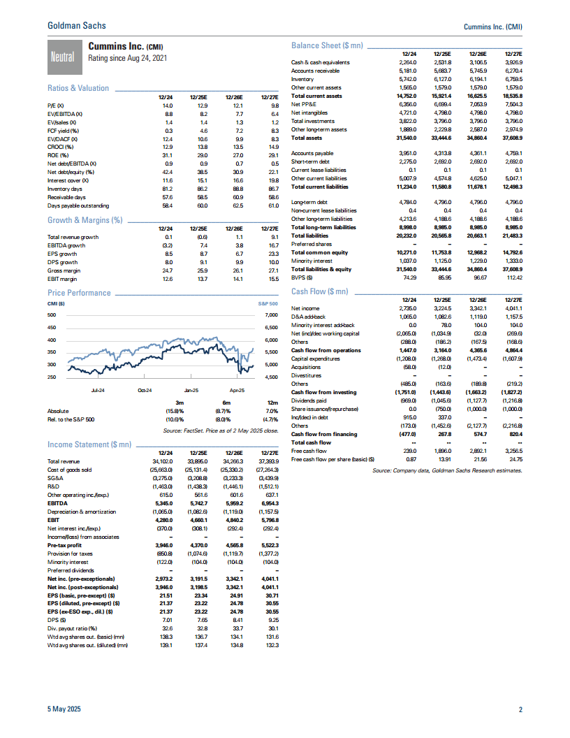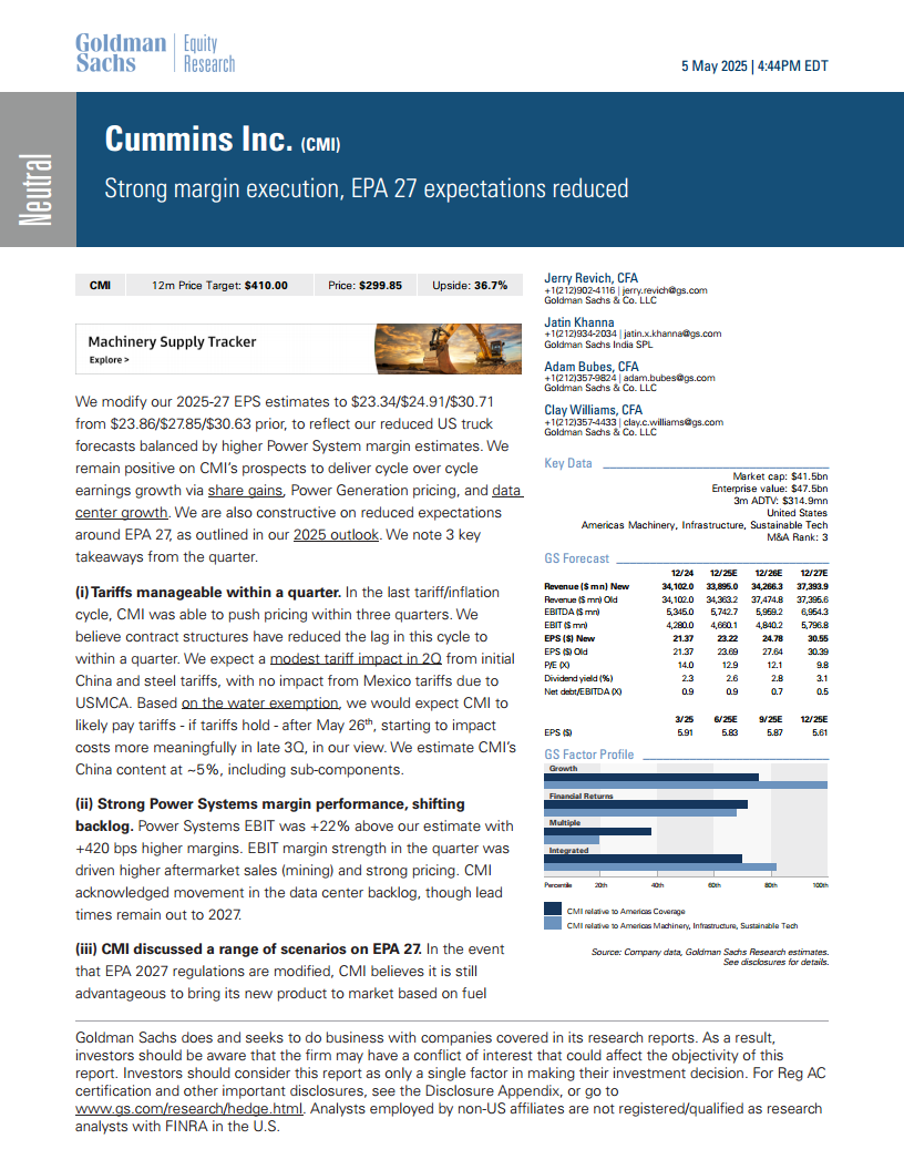 本报告对康明斯(CMI)的财务表现和市场前景进行了专业而深入的分析。尽管面临美国卡车市场预测下调和关税等外部挑战,康明斯凭借其强劲的利润执行能力,尤其是在动力系统业务(受数据中心需求驱动)的卓越表现,成功抵消了部分不利影响。公司第一季度EBITDA超出预期9%,利润率提升130个基点,显示出其核心业务的韧性和盈利能力。高盛维持410美元的目标价,并认为公司通过市场份额增长、发电业务定价优化和数据中心业务扩张,有望实现持续的周期性盈利增长。此外,康明斯在应对关税影响方面展现出快速的定价调整能力,并计划推出具有显著燃油效率优势的新产品以应对EPA 2027法规,进一步巩固其市场竞争力。尽管新卡车库存高企和货运市场低位企稳,但二手卡车库存的下降也反映出市场正在逐步调整。整体而言,康明斯展现出稳健的运营和积极的市场应对策略,其未来增长潜力值得关注。