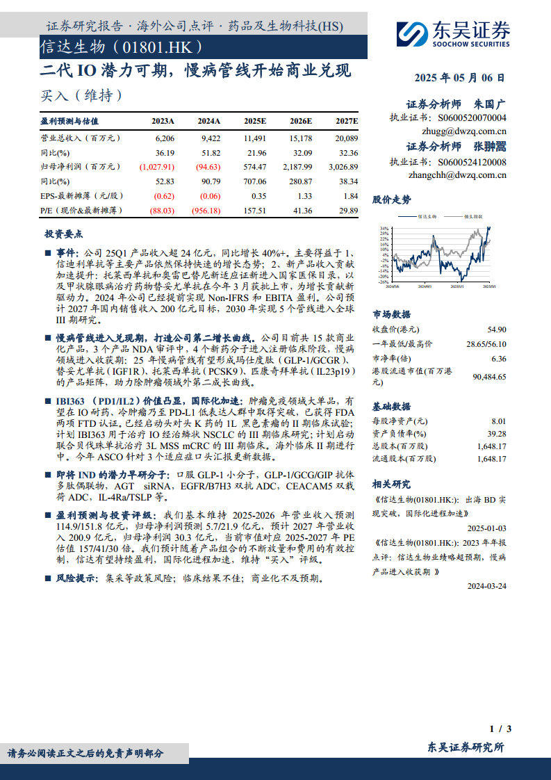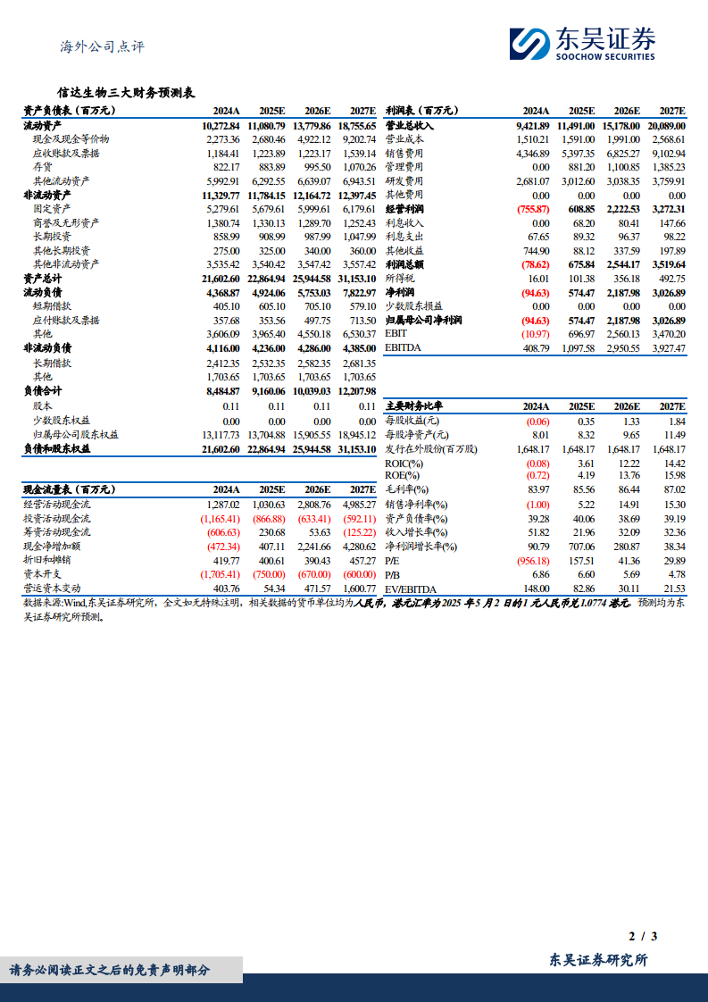 东吴证券维持对信达生物的“买入”评级,并给出了积极的盈利预测: