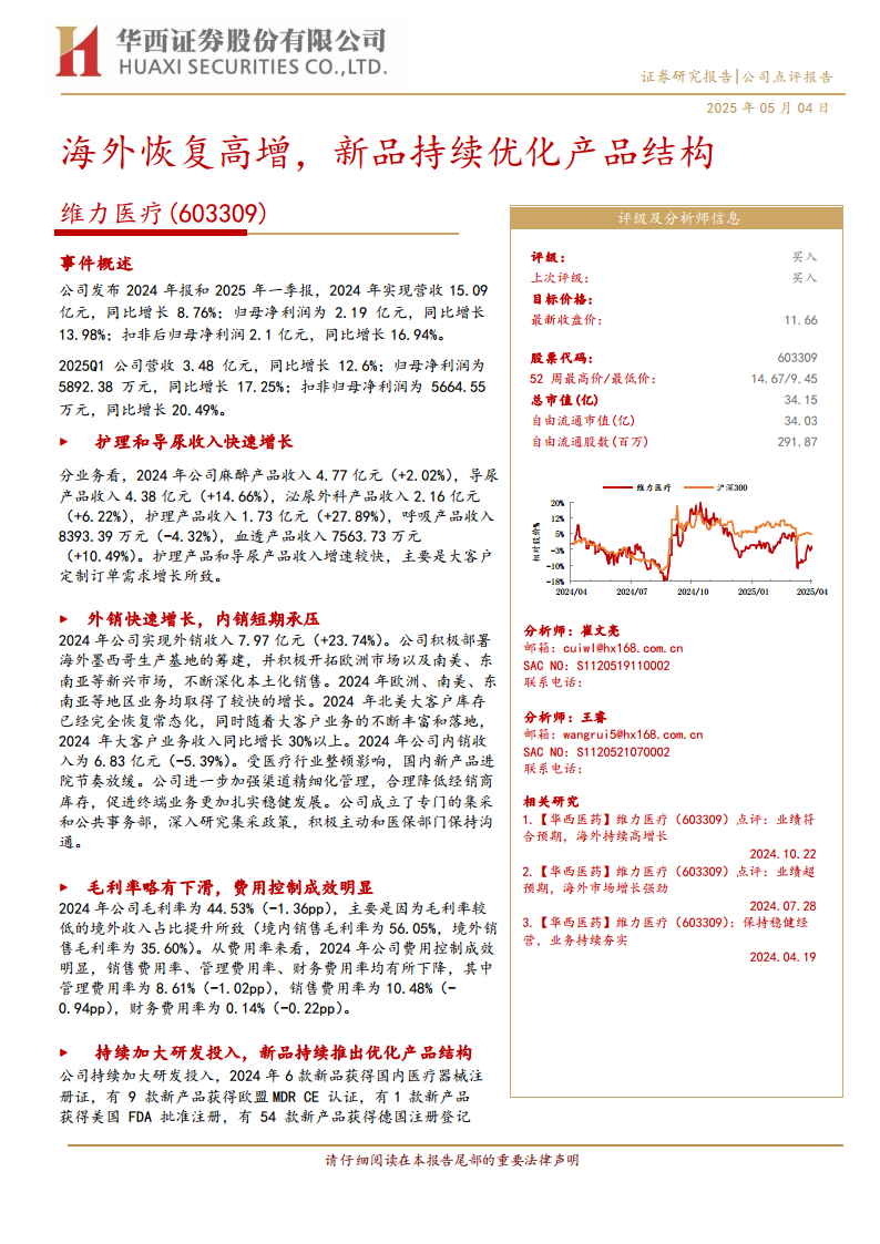 基于维力医疗2024年及2025年第一季度的稳健表现,以及其在海外市场的强劲增长势头和持续的研发创新投入,华西证券对公司的盈利预测进行了调整。