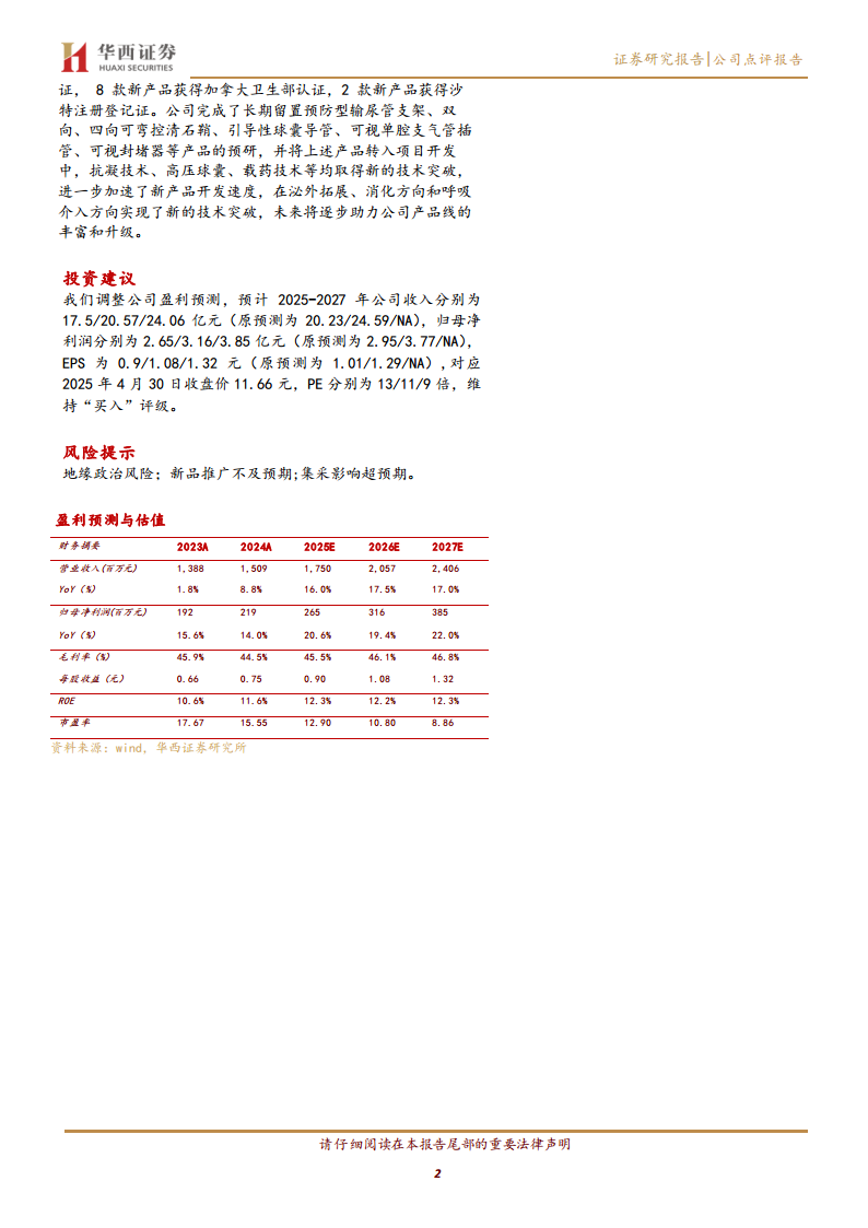 以2025年4月30日收盘价11.66元计算,公司对应的2025年、2026年和2027年市盈率(PE)分别为13倍、11倍和9倍。这些估值水平在医疗器械行业中具有一定的吸引力,尤其考虑到公司稳健的业绩增长和未来的发展潜力。