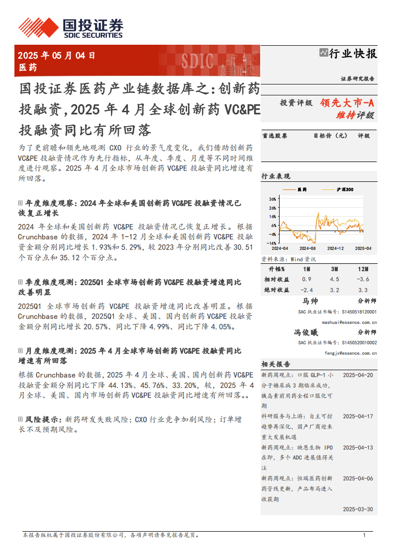本报告通过对创新药VC&PE投融资数据的多维度分析,揭示了当前医药产业链的景气度变化。2024年度和2025年第一季度全球创新药投融资表现出积极的复苏迹象,尤其是在年度维度上全球和美国市场已恢复正增长,且2025Q1全球投融资增速同比改善明显。然而,2025年4月的月度数据显示,全球、美国及国内创新药VC&PE投融资均出现显著同比回落,表明短期内市场活跃度面临挑战。同时,报告强调了新药研发失败、CXO行业竞争加剧以及订单增长不及预期等关键风险,提示投资者需审慎评估。
