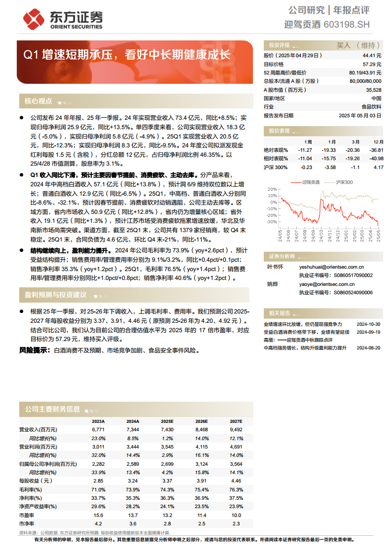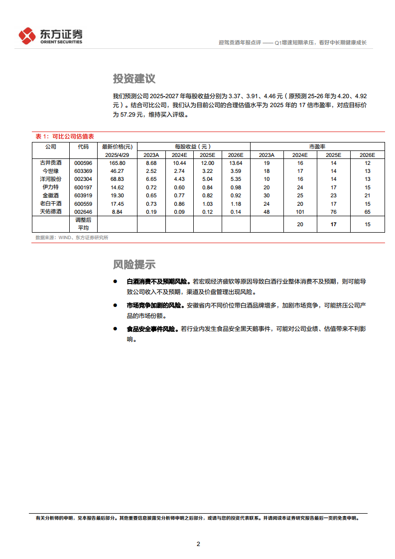 在投资建议方面,分析师结合可比公司的估值水平,认为目前迎驾贡酒的合理估值水平为2025年17倍市盈率。基于此估值,对应目标价格为57.29元人民币。鉴于当前股价(2025年4月29日为44.41元)与目标价之间存在一定的上涨空间,分析师维持对迎驾贡酒的“买入”评级。这一评级反映了分析师对公司中长期健康成长的信心,认为尽管短期业绩承压,但其内在价值和发展潜力仍被低估。