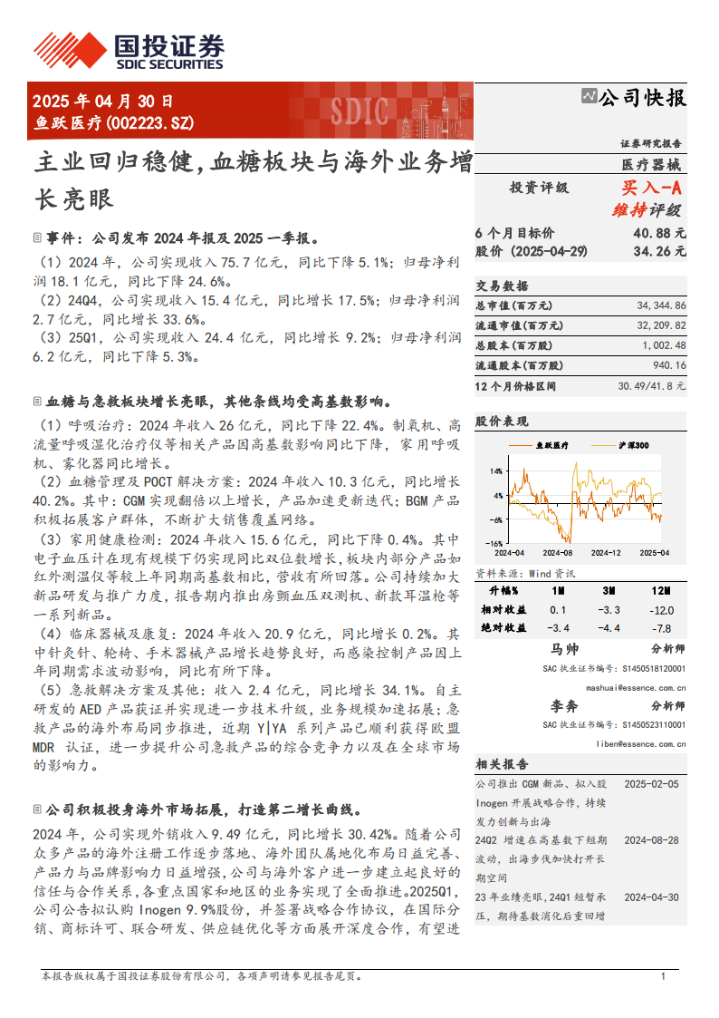 鱼跃医疗在2024财年及2025年第一季度展现出其主营业务的稳健性和结构性优化。尽管2024年整体业绩受到高基数效应的短期影响,公司通过聚焦核心增长领域,成功实现了血糖管理及POCT解决方案板块40.2%的显著增长,其中连续血糖监测(CGM)业务更是实现了翻倍以上的增长,成为公司业绩增长的关键驱动力。同时,急救解决方案板块也录得34.1%的强劲增长,显示出其在特定医疗需求市场的快速响应能力和技术优势。