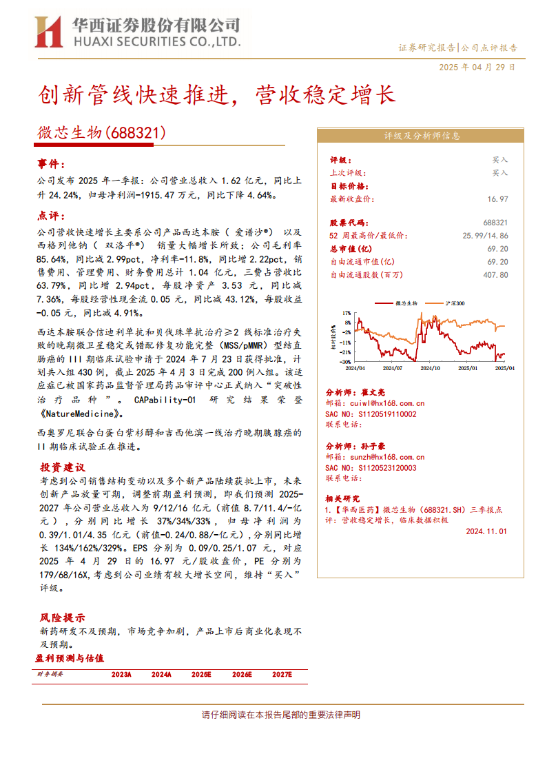 考虑到公司销售结构的变化以及多个新产品有望陆续获批上市,未来创新产品放量可期。华西证券研究所调整了对微芯生物的盈利预测,预计2025-2027年公司营业总收入分别为9亿元、12亿元和16亿元,同比分别增长37%、34%和33%。同期归母净利润预计分别为0.39亿元、1.01亿元和4.35亿元,同比分别增长134%、162%和329%。