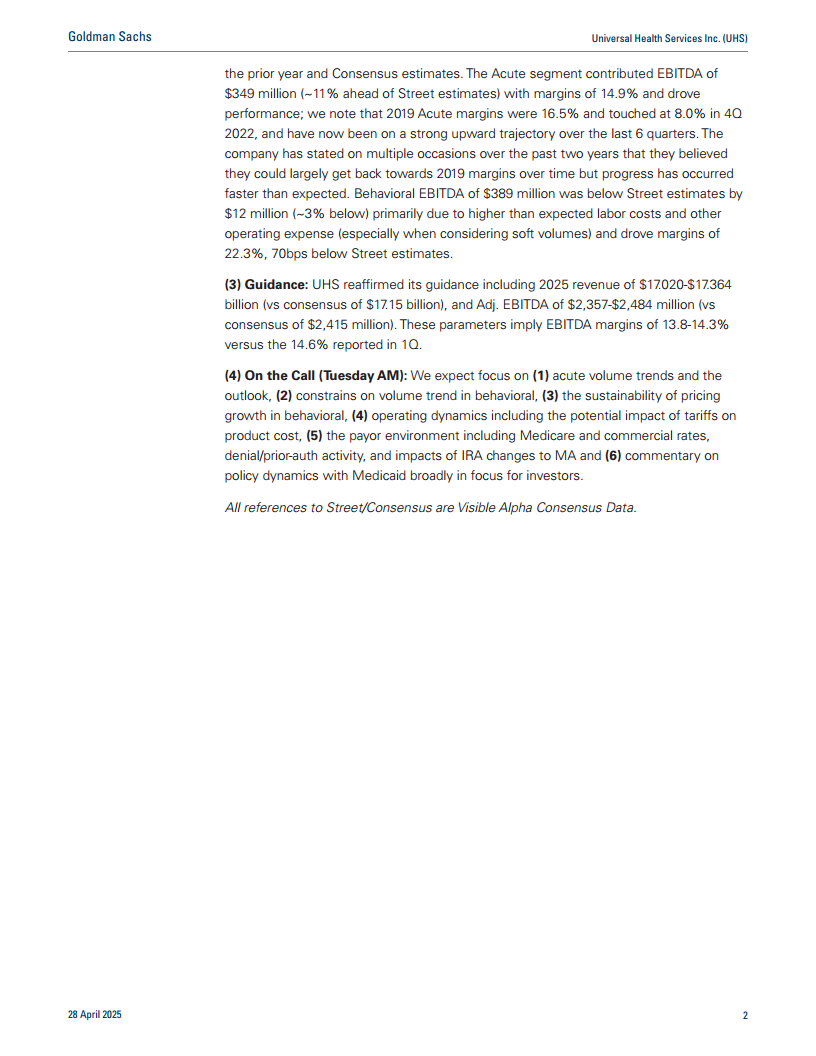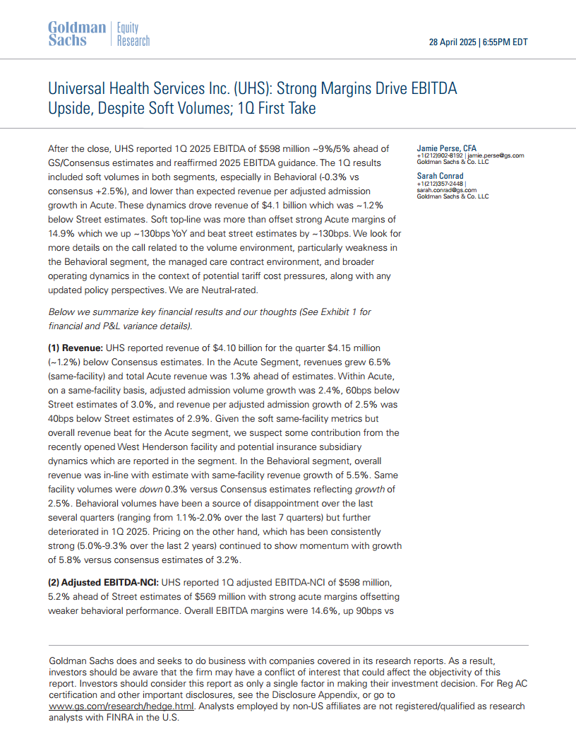 Universal Health Services Inc. (UHS) 在2025年第一季度实现了5.98亿美元的调整后EBITDA,超出高盛和市场普遍预期约5%至9%。这一强劲表现主要得益于急性护理部门(Acute Segment)显著提升的利润率,其EBITDA利润率达到14.9%,同比上升约130个基点,并超出市场预期约130个基点。尽管总营收为41亿美元,略低于市场预期1.2%,且行为健康部门(Behavioral Segment)的业务量表现疲软,但急性护理部门的优异表现有效抵消了这些负面影响。