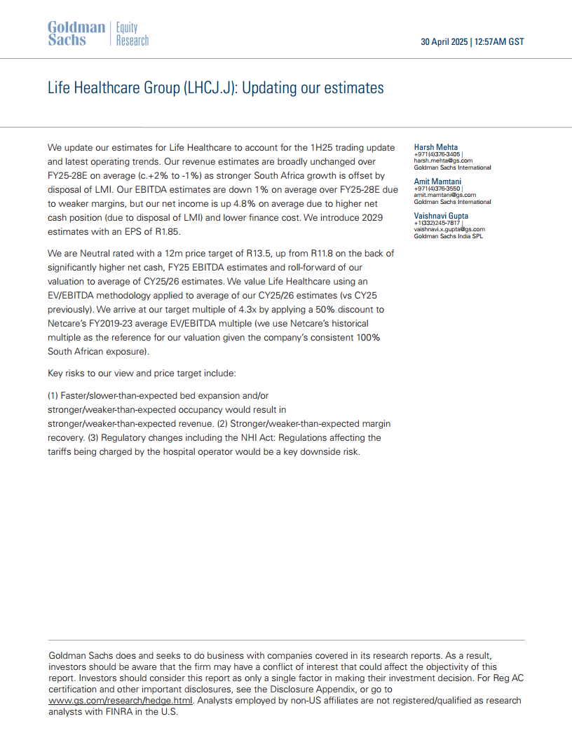高盛根据Life Healthcare Group (LHCJ.J) 2025财年上半年的交易更新及最新运营趋势,对其财务估算进行了调整。报告指出,尽管南非业务表现出强劲增长势头,但LMI资产的剥离在一定程度上抵消了收入增长,使得2025-2028财年的平均收入估算大致保持不变。同时,由于利润率面临压力,EBITDA估算略有下调。然而,得益于LMI剥离带来的净现金头寸显著增加以及融资成本的降低,公司的净收入估算在同期内实现了平均4.8%的增长。此外,高盛首次引入了2029年的估算,预计每股收益(EPS)将达到R1.85。
