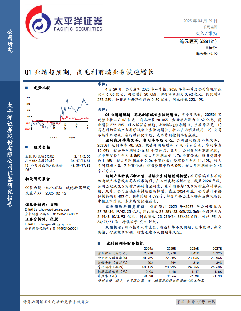 皓元医药2025年第一季度业绩表现亮眼,营收和利润均实现高速增长,特别是利润端大幅超出市场预期。这主要得益于公司高毛利前端业务的快速发展以及精细化管理带来的成本费用优化。公司盈利能力持续改善,毛利率和净利率显著提升,各项费用率得到有效控制。在业务布局方面,公司前端产品种类不断丰富,后端业务创新转型成果显著,多个项目进入后期阶段,为未来业绩增长奠定基础。基于对公司未来营收和净利润的积极预测,分析师维持“买入”评级,但投资者仍需关注核心人才流失、订单不及预期、汇率波动、存货减值、行业竞争加剧以及研发进度等潜在风险。