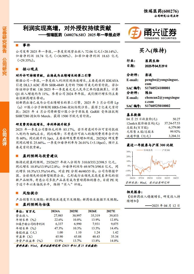 恒瑞医药2025年一季度业绩表现亮眼,营收和净利润均实现高增长,主要得益于创新药的持续发力和国际化战略的成功推进,特别是多项对外许可交易贡献了可观的首付款。公司在加大研发投入的同时,有效提升了盈利能力。展望未来,恒瑞医药凭借其领先的创新产品矩阵和重磅药物潜力,有望继续保持稳健增长。当前估值水平具有吸引力,分析师维持“买入”评级,但投资者仍需关注产品销售、新药临床进度及数据等潜在风险。