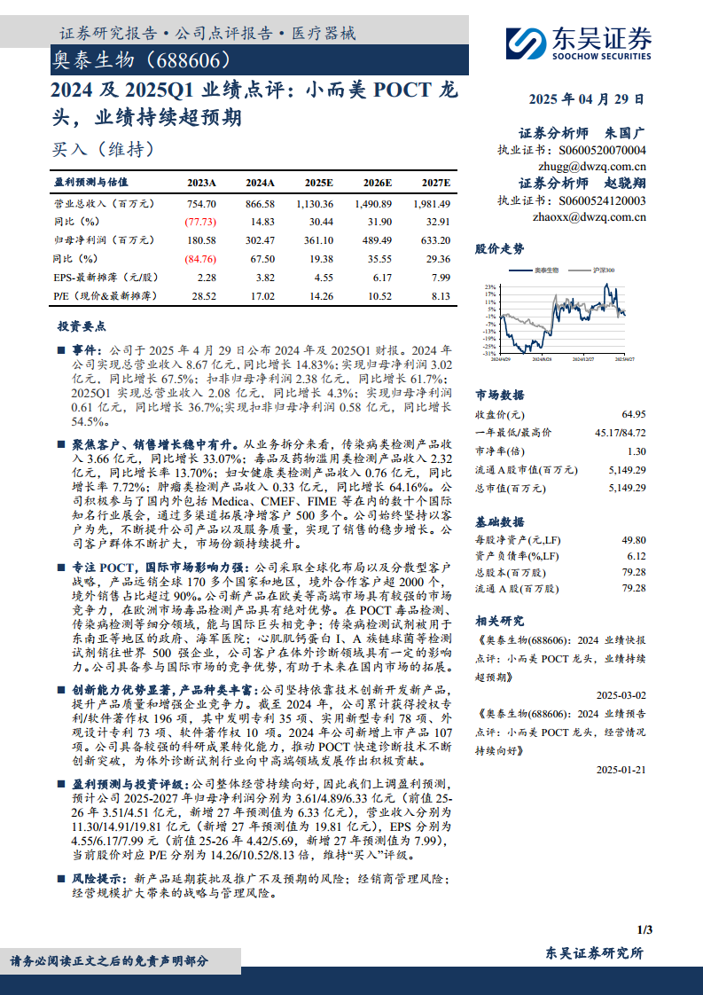 奥泰生物(688606)在2024年及2025年第一季度展现出强劲的财务表现,业绩持续超出市场预期。公司作为“小而美”的POCT(即时检验)领域龙头企业,通过聚焦客户需求、深化全球化布局以及持续的技术创新,实现了营收和净利润的显著增长。2024年归母净利润同比增长67.5%,2025年第一季度归母净利润同比增长36.7%,充分印证了其在体外诊断市场的竞争优势和盈利能力。东吴证券维持“买入”评级,反映了市场对其未来增长潜力的认可。