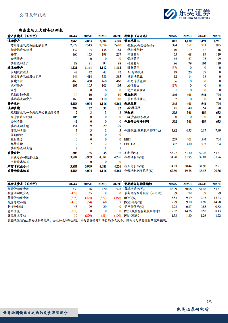 基于公司持续向好的经营状况,东吴证券上调了奥泰生物的盈利预测并维持“买入”评级。