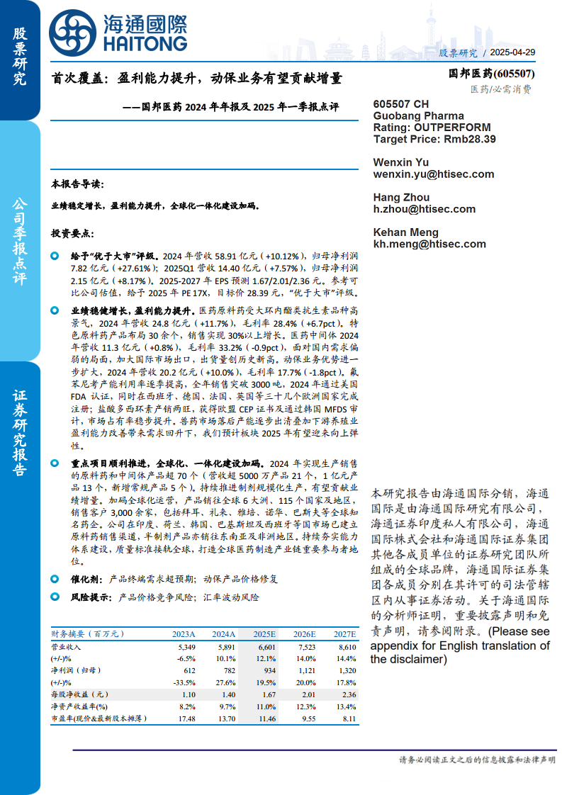 国邦医药(605507):2024年年报及2025年一季报点评:首次覆盖:盈利能力提升,动保业务有望贡献增量