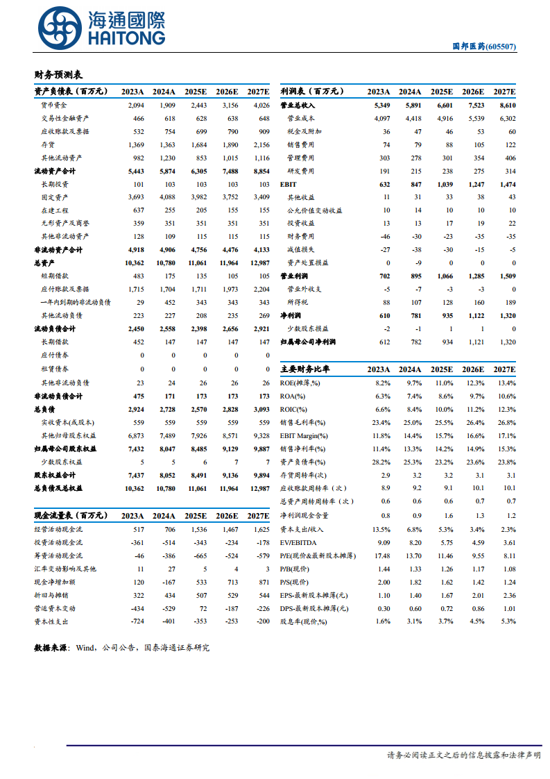 国邦医药在2024年及2025年第一季度均实现了营收和归母净利润的稳定增长,尤其在2024年归母净利润同比增长27.61%,显示出强劲的盈利能力提升。这主要得益于医药原料药业务中大环内酯类抗生素的高景气度以及特色原料药产品的快速增长,同时动保业务也保持了良好的发展势头。